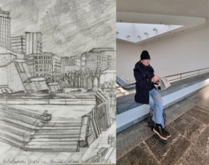Heute im Foyer, 1. Etage, Gemäldegalerie, mit Blick auf die Potsdamer Straße mit Marion Brinkmann nach längerem mal wieder zusammen gezeichnet. Das Motiv aus dem Fenster zeigte uns viele verschiedene Gebäude, Terrassen, Treppen, Baustellenzäune, geparkte Autos und und. Das dauert ehe da „Land in Sicht ist“ auf dem Papierblatt.