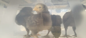 Während der Säuberung des Küken-Käfigs müssen die Küken des Deutsche Kinderschutzbund Ortsverband Gifhorn e.V. in eine durchsichtigen Kunststoffbehälter. Sie sehen darin bisschen aus wie ESSEN, find ich.