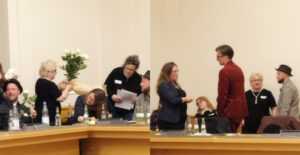Die Veranstaltung fand in einem Konferenzraum im ersten Obergeschoss statt. Ich war früh genug vor Ort, um mir einen Platz am Konferenztisch zu sichern; die später Eintreffenden mussten sich mit Stühlen in zweiter und dritter Reihe begnügen. Insgesamt waren etwa 80 Personen anwesend, mehrheitlich Künstler:innen.