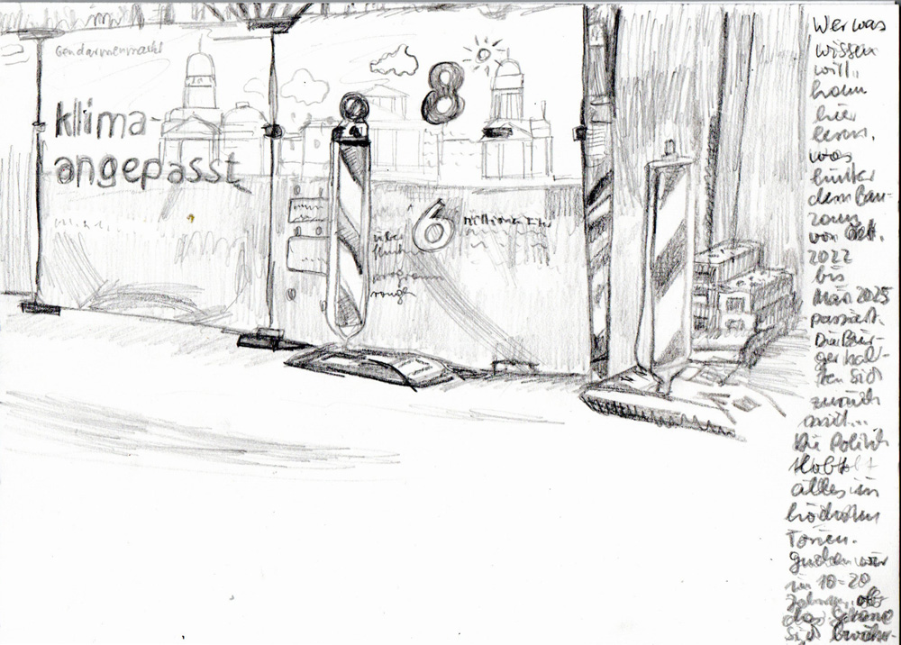 In meiner Zeichenserie widme ich mich Details des Platzes und der klimagerechten Sanierung 2022 – 2025. Mit dem Arbeitstitel „Herr Gaebler, nehmen Sie Sonnenschutz?“ beziehe ich mich auf die kontrovers diskutierte Entscheidung des Berliner Bausenators, dem Ensemble keine Grünflächen hinzuzufügen und stattdessen denkmalgetreu zu sanieren. Die selbst eingesprochenen Randnotizen: https://youtu.be/8Cmkaraj_tI?t=10 konnotieren Pressebilder zur Umgestaltung des Platzes, spiegeln aber auch persönliche Beobachtungen wieder.